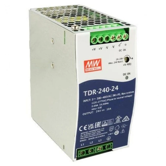 15. Zasilacz impulsowy AC/DC na szynę DIN trójfazowy 240W 3x340-550VAC Uwyj 24VDC 10A PFC aktywne TDR-240-24 451.90