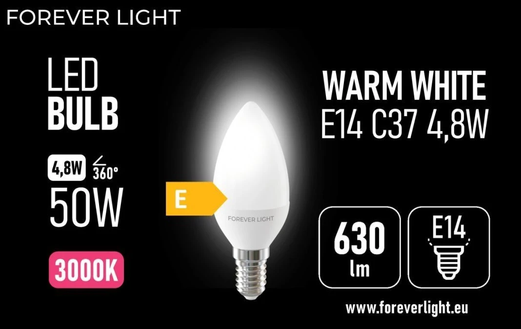 15. Żarówka LED E14 C37 4.8W 630lm 3000K klasa E Forever Light 3.57