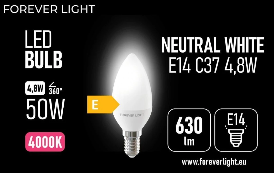 14. Żarówka LED E14 C37 4.8W 630lm 4000K klasa E Forever Light 3.57