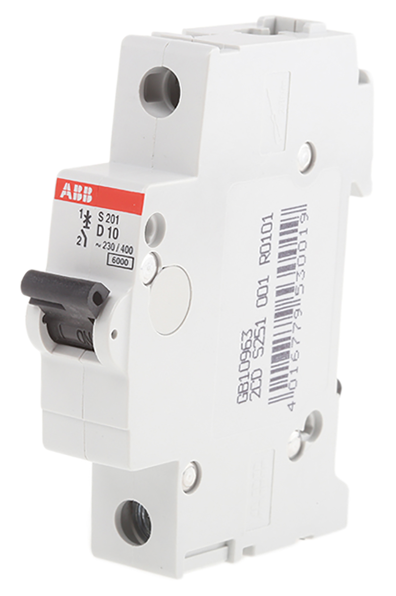 9. Wyłącznik nadprądowy MCB, Typ D, 1-biegunowy, 10A, 253V, 72V, na szynę DIN, ABB S201-D10, S200 111.47