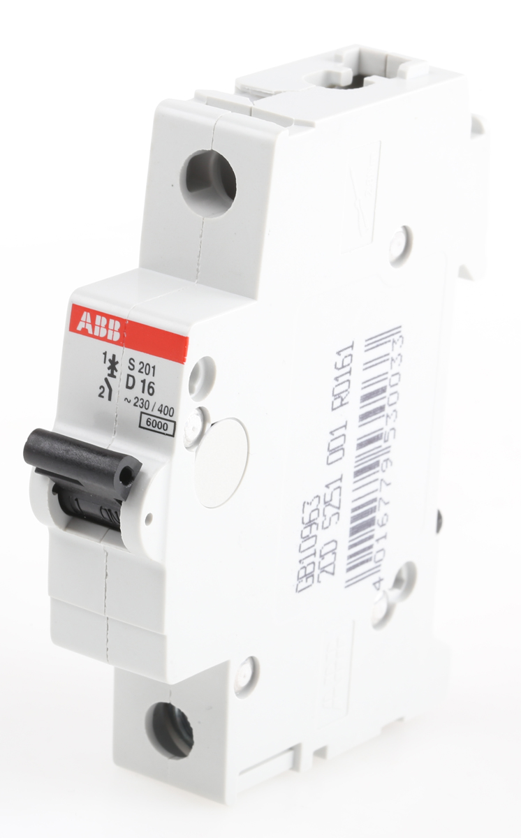 10. Wyłącznik nadprądowy MCB, Typ D, 1-biegunowy, 16A, 253V, 72V, na szynę DIN, ABB S201-D16, S200 111.47
