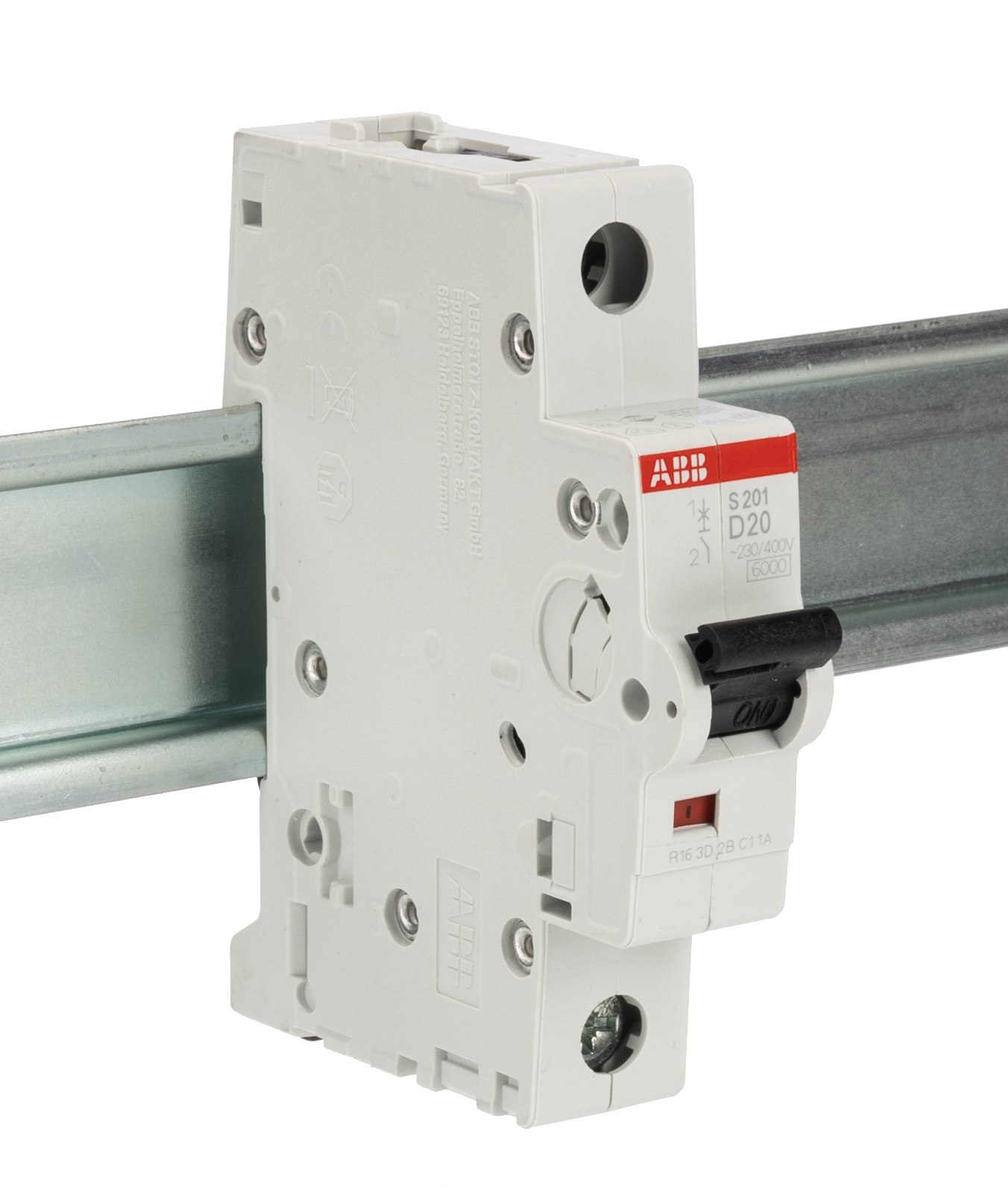 Wyłącznik nadprądowy MCB, Typ D, 1-biegunowy, 20A, 253V, 72V, na szynę DIN, ABB S201-D20, S200