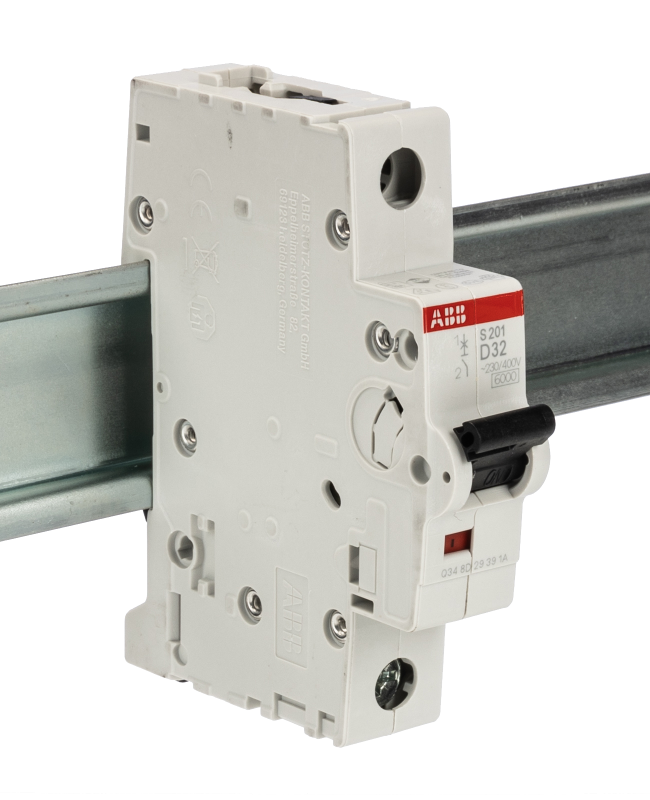 5. Wyłącznik nadprądowy MCB, Typ D, 1-biegunowy, 32A, 253V, 72V, na szynę DIN, ABB S201-D32, S200 111.47