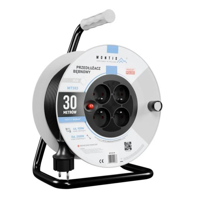 Przedłużacz bębnowy MT103-30 4x2p+Z IP20 16A 3x1,5 30m Montis czarny