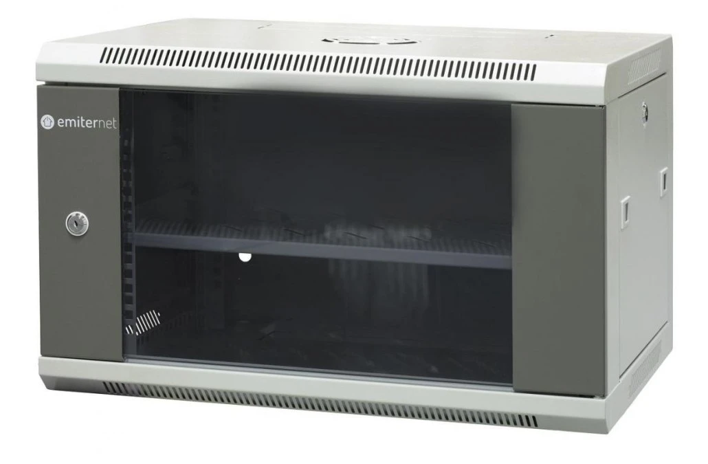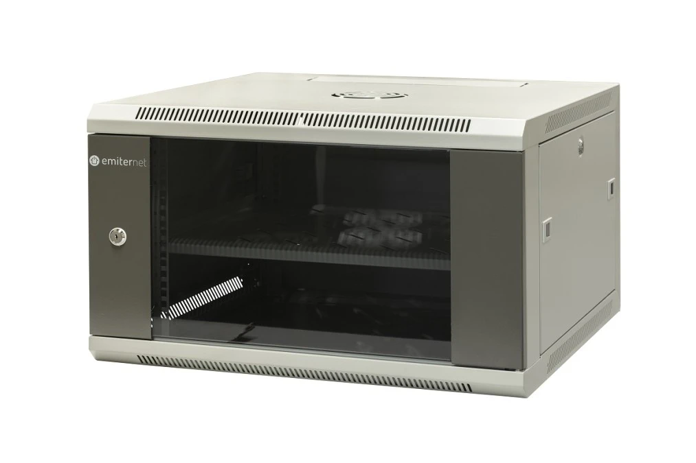 15. Szafa wisząca niedzielona 19 6U, drzwi blacha/szkło, ściągane osłony boczne z zamkiem,600×600×370 szer./gł./wys. mm RAL: szafa 381.21