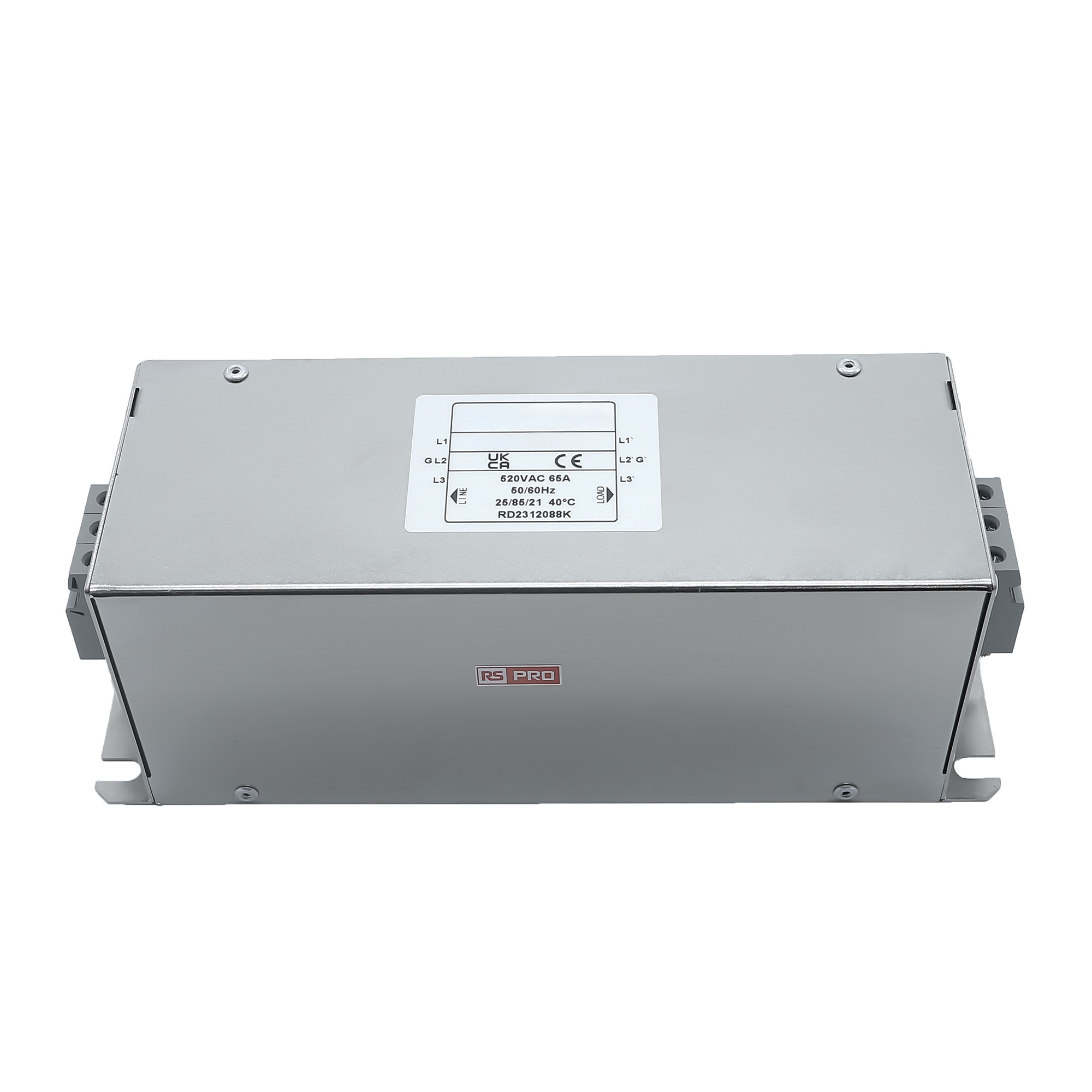 Filtr sieciowy 65A 3-fazowy 330kΩ/1MΩ 300/520 V AC 50 → 60Hz 3 x 0,4mH RS PRO Montaż w obudowie