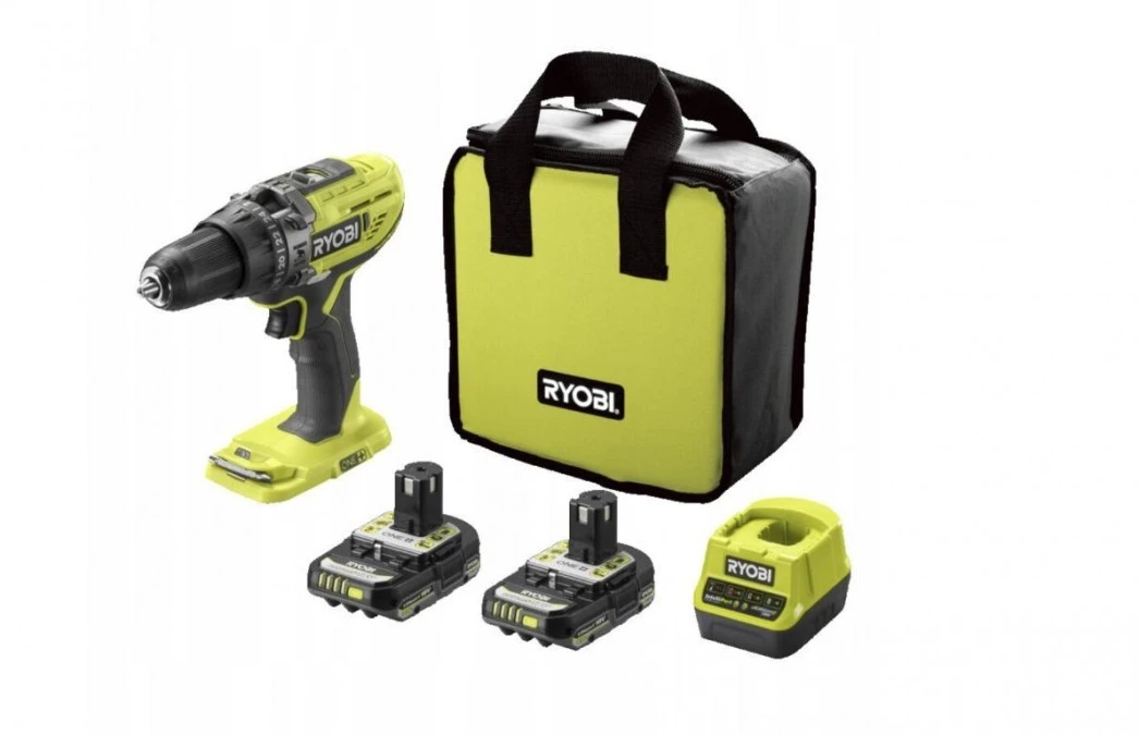 Zestaw Ryobi Wiertarko-wkrętarka udarowa 18V, kompresor wysokociśnieniowy 18V, 2x akumulator 2.0Ah wraz z ładowarką oraz miękka