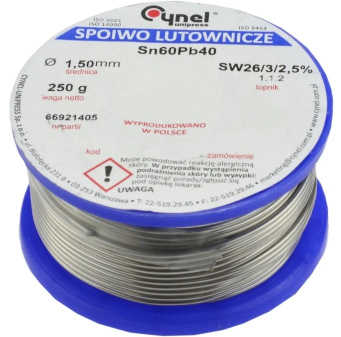 11. CYNEL UNIPRESS Cyna 1,50mm 250g Sn60Pb40 SW26/3/2.5 spoiwo lutownicze PROFESSIONAL 90.63