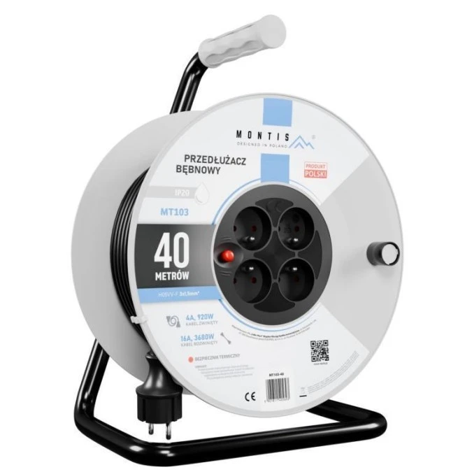 1. Przedłużacz bębnowy MT103-40 4x2p+Z IP20 16A 3x1,5 40m Montis czarny 452.64