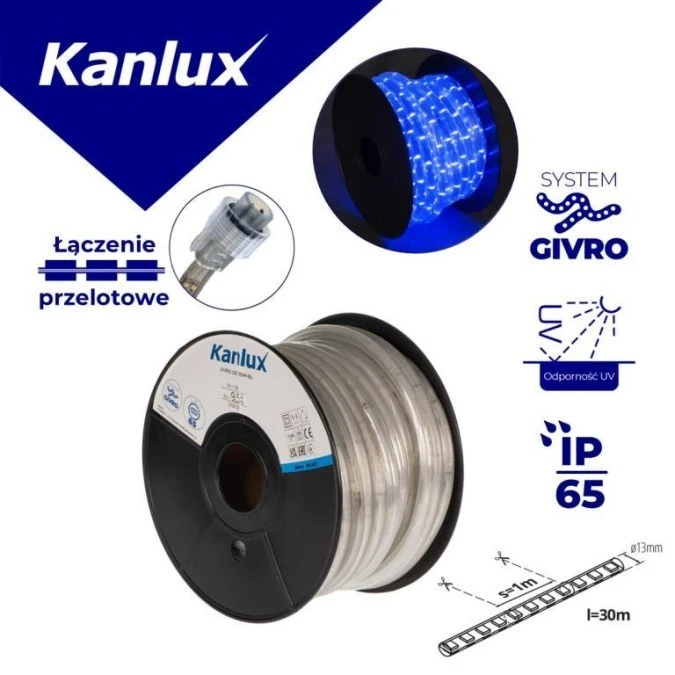 Wąż świetlny GIVRO LED 30M-BL 2W/M 9,5lm/m barwa niebieska IP65 rolka 30mb Odporność UV zasilanie przelotowe 38588