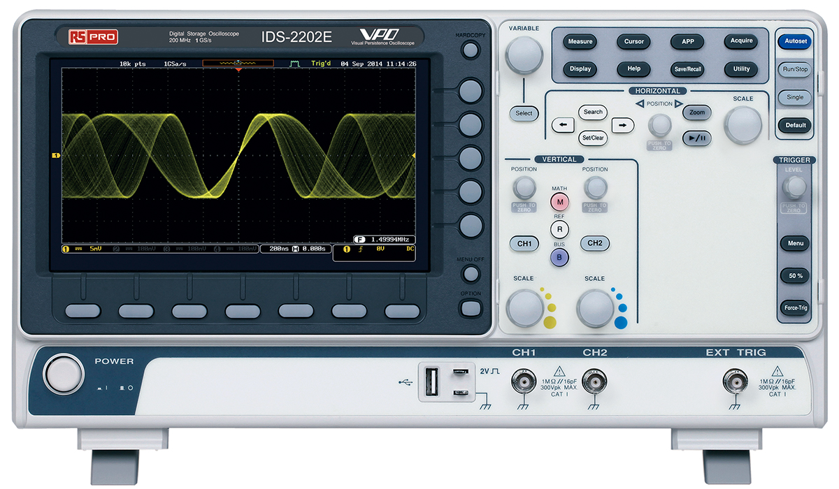 Oscyloskop 200MHz RS PRO Cyfrowa pamięć masowa CAT I 300 V, CAT II 300 V IDS2202E z kalibracją ISO CAN, IIC, LIN, SPI,