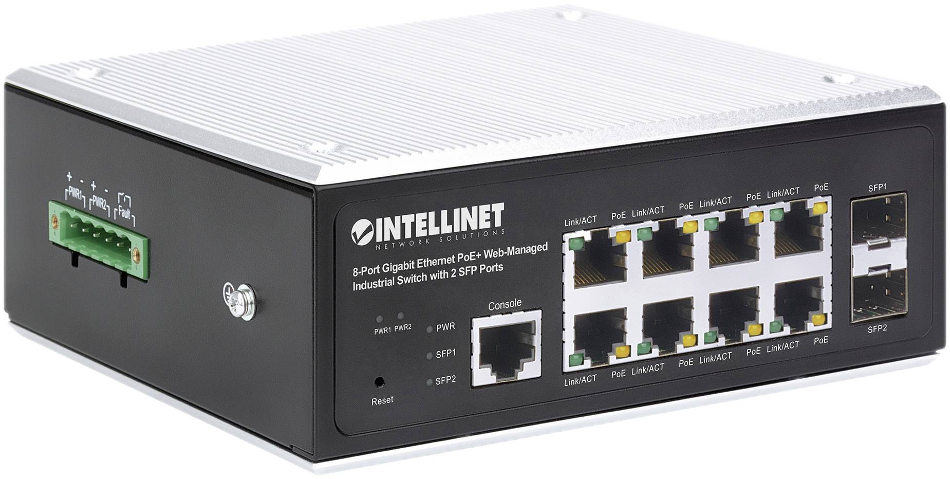 INTELLINET 8-portowy gigabitowy Ethernet PoE+ przemysłowy przełącznik zarządzany przez Internet z 2 portami SFP