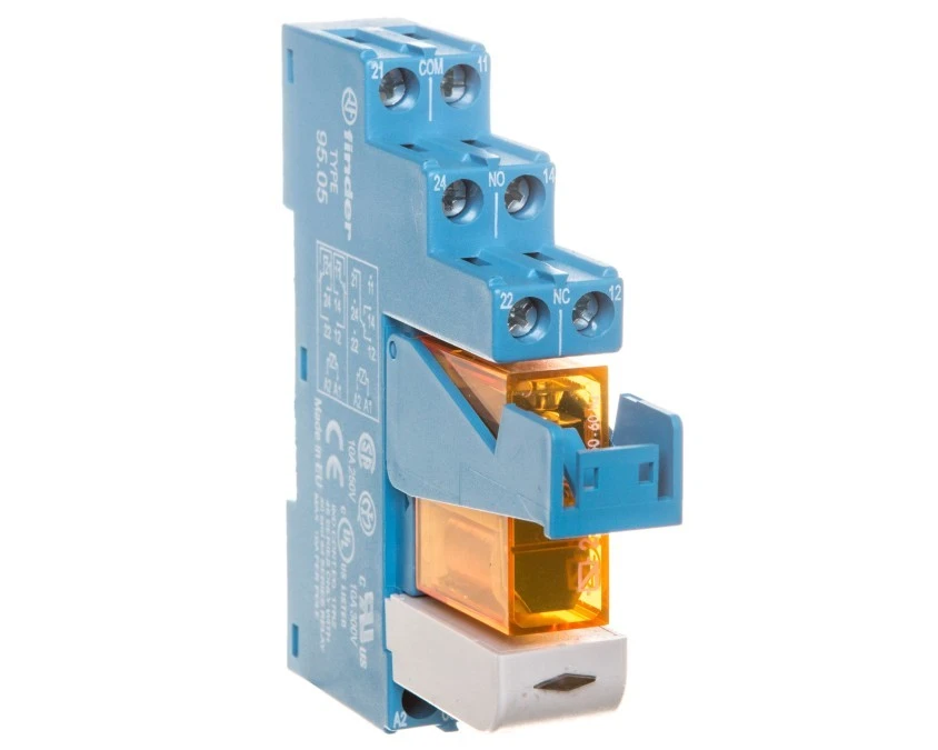 10. Moduł interfejsowy 27mm, 2P 10A 24V AC, styki AgNi, wskaźnik zadziałania, blokada, przycisk testujący, DIN 58.32.8.024.0060SPA 92.74
