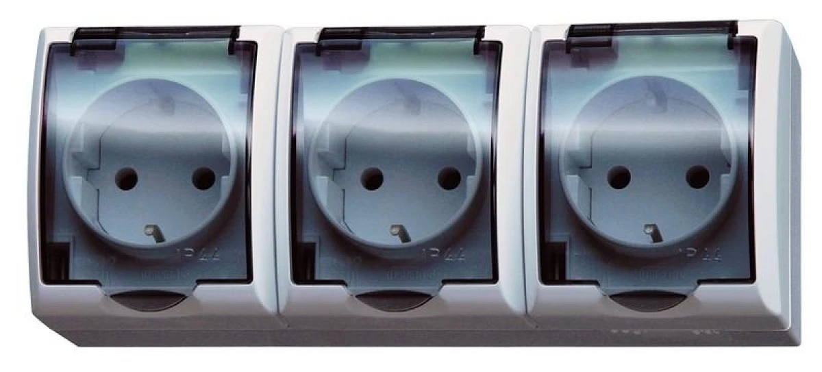 9. FALA Gniazdo hermetyczne potrójne z/u Schuko IP44 klapka przezroczysta białe GNH-3HS/00/d 53.87