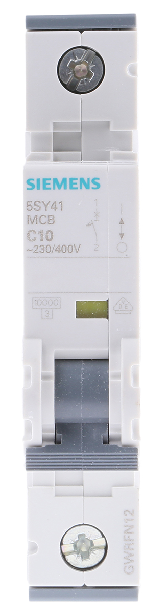 10. Wyłącznik nadprądowy MCB, Typ C, 1-biegunowy, 10A, 400V, 72V, na szynę DIN, Siemens, 5SY4 170.48