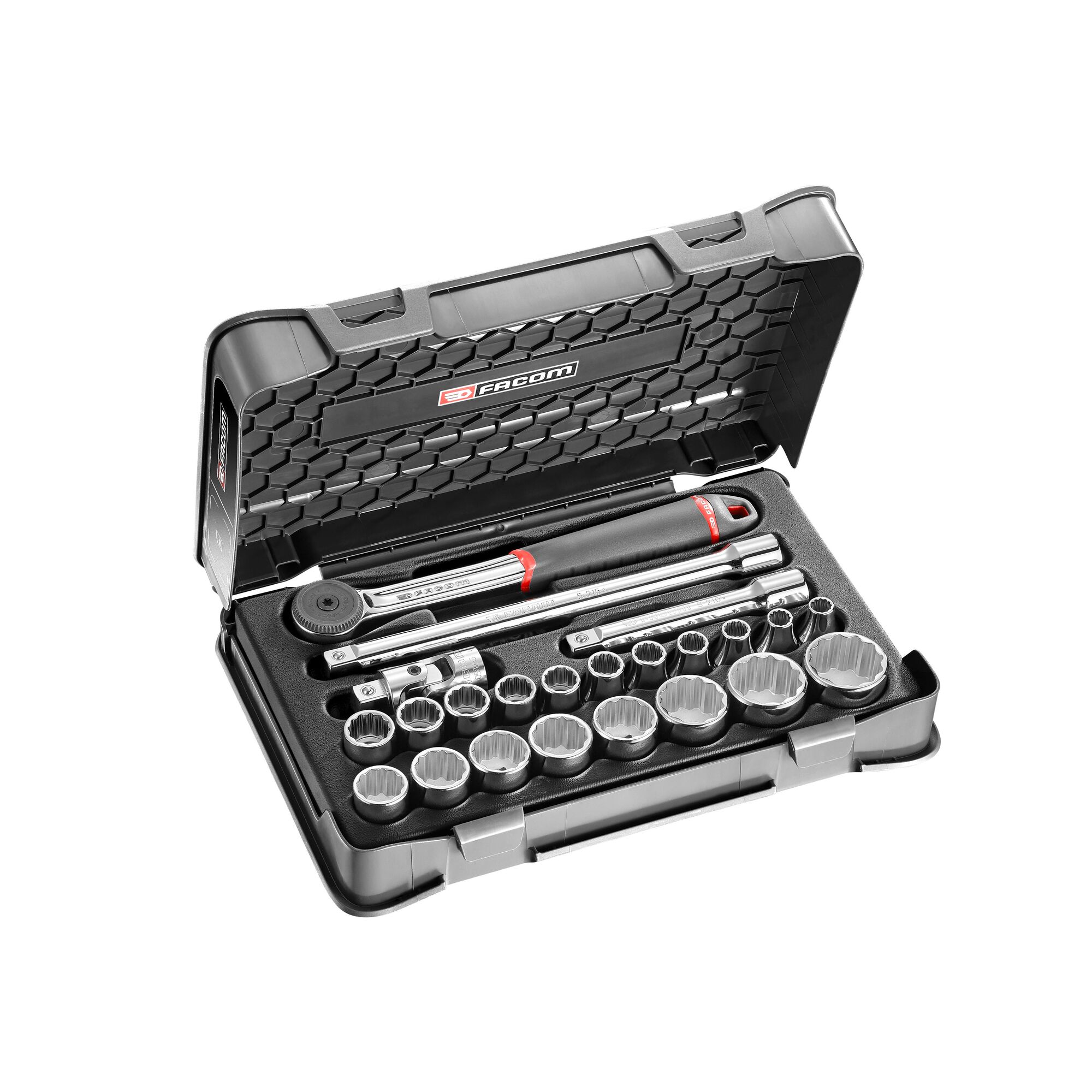 Zestaw nasadek rozmiar napędu 1/2 cala elementy: 22 Facom typ napędu Kwadratowy gniazdo 3/8" , 7/16" , 1/2" , 9/16" ,