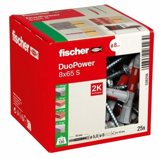 6. Kołki rozporowe uniwersalne DuoPower 8x65 S z wkrętem z łbem stożkowym 5,0x80 PZ2 25 sztuk FISCHER 51.60