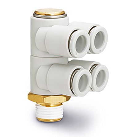 4. Złączka pneumatyczna 4 mm R 1/8 męskie SMC Uniwersalne kolanko obejmowane z potrójnym rozgałęzieniem R 1/8 męskie 821.52