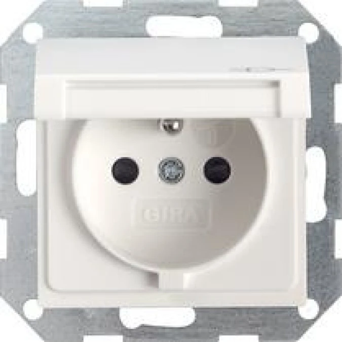 GIRA F100 Gniazdo z bolcem ochronnym i klapką IP44 z przesłonami torów prądowych biały połysk
