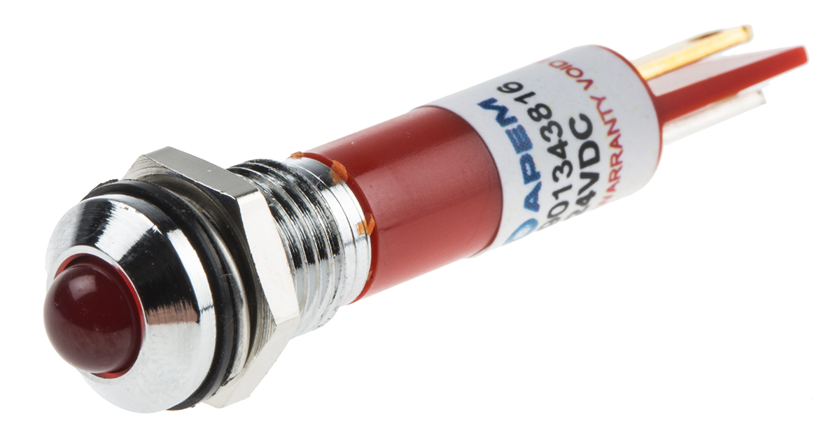 Lampka kontrolna do montażu panelowego 24V dc, czerwona 8mm LED Chrom Faston, oczko lutownicze RS PRO