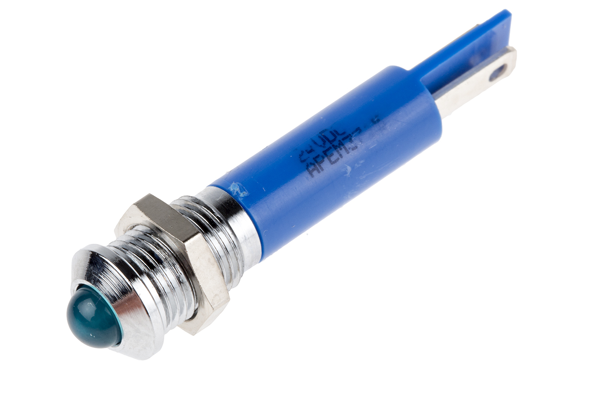 2. Lampka kontrolna do montażu panelowego 24V dc, niebieska 8mm LED Chrom Faston, oczko lutownicze RS PRO 108.55