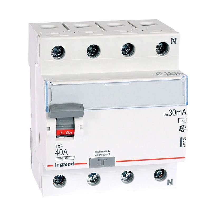 1. Wyłącznik różnicowoprądowy RCD 3-fazowy 40A 30mA typ AC 4-biegunowy 4P (400V AC) 4-modułowy TX3 Legrand 185.79
