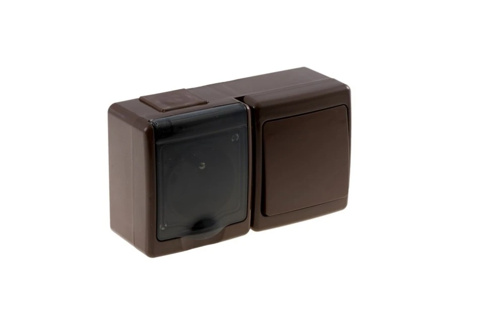 9. Wyłącznik BETA1, pojedynczy, jednobiegunowy z gniazdem BETA1, pojed., 2P+Z, IP44, dymnym, ob. brąz D.3212GW/1 26.38