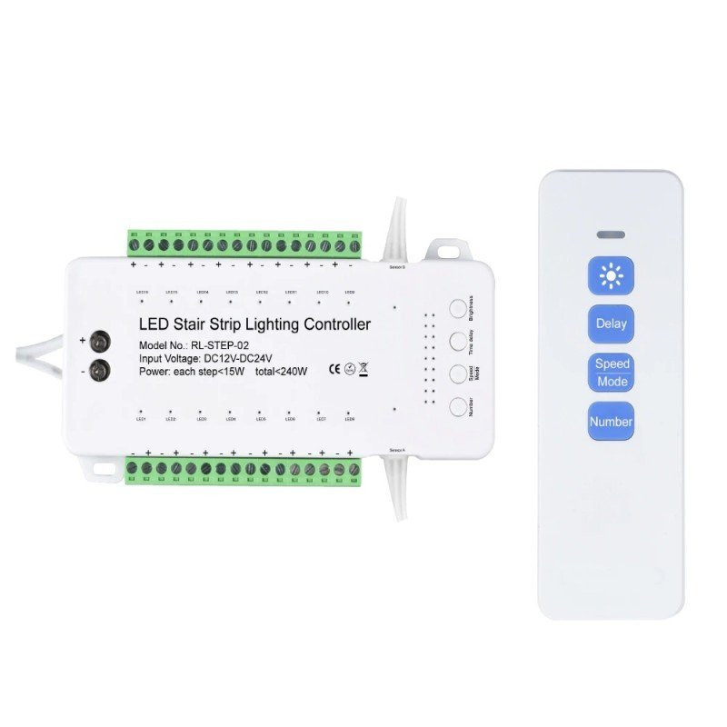 Sterownik LED schodowy 16-kanał. z pilotem + 2x czujnik PIR, zestaw, kontroler