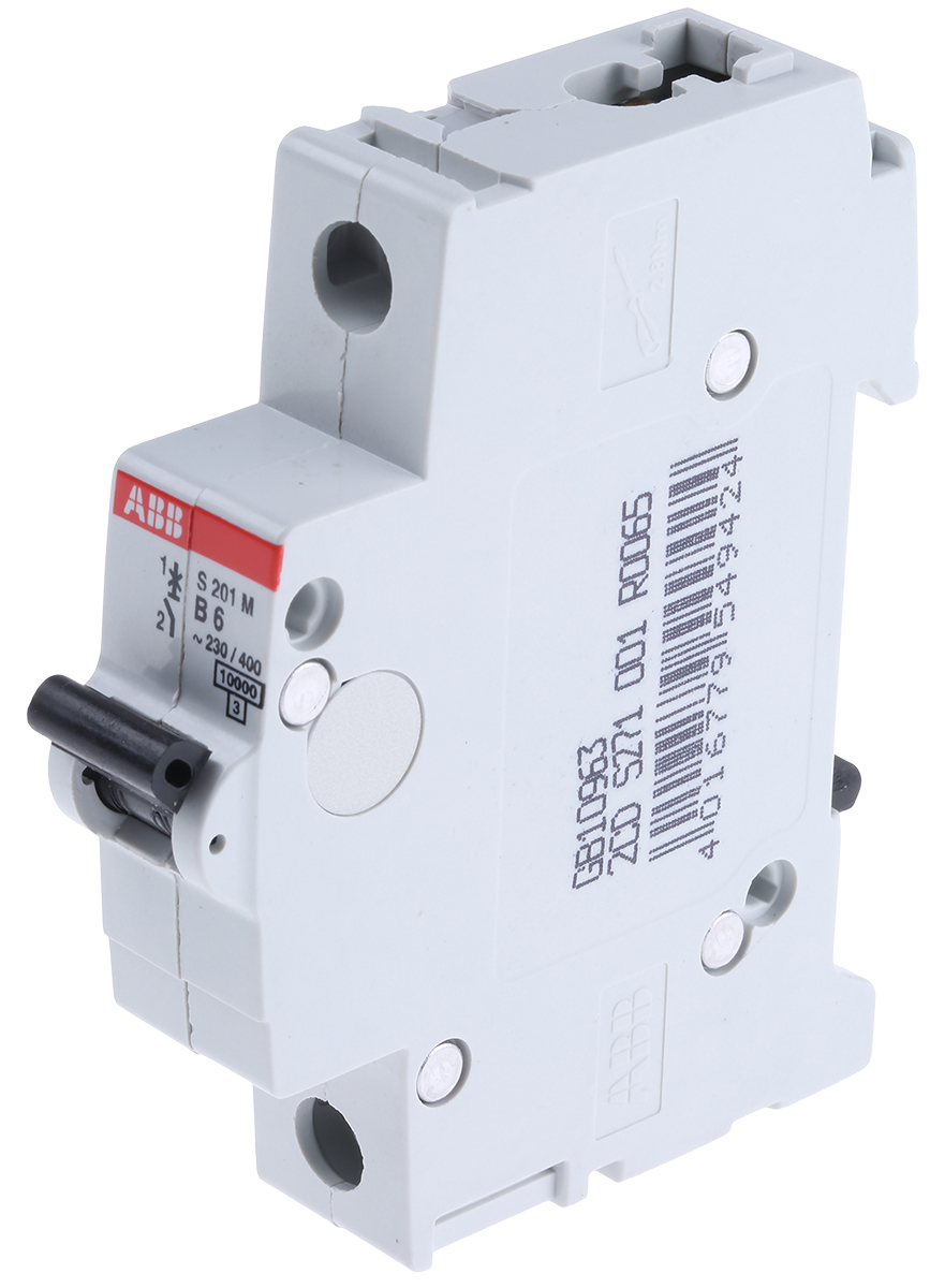 9. Wyłącznik nadprądowy MCB, Typ C, 1-biegunowy, 6A, 253V, 72V, na szynę DIN, ABB S201M-C6, S200M 128.55