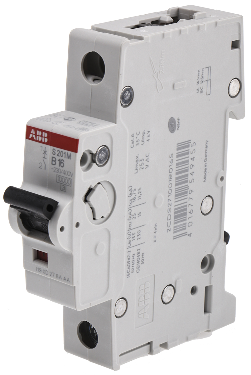 5. Wyłącznik nadprądowy MCB, Typ C, 1-biegunowy, 16A, 253V, 72V, na szynę DIN, ABB S201M-C16, S200M 118.73