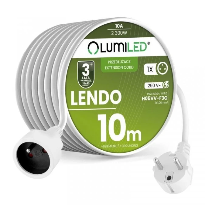 Przedłużacz Sieciowy Kabel z Uziemieniem Listwa Zasilająca 1 Gniazdo 10m Biały Sznur Lendo Lumiled