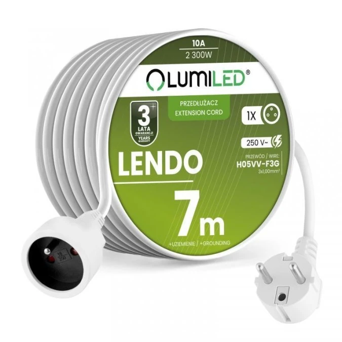 Przedłużacz Sieciowy Kabel z Uziemieniem Listwa Zasilająca 1 Gniazdo 7m Biały Sznur Lendo Lumiled