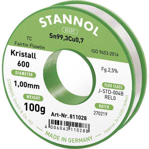 Stannol 811028 Kristall 600 Solder Lead-free Sn99.3Cu0.7 1mm 100g REL0