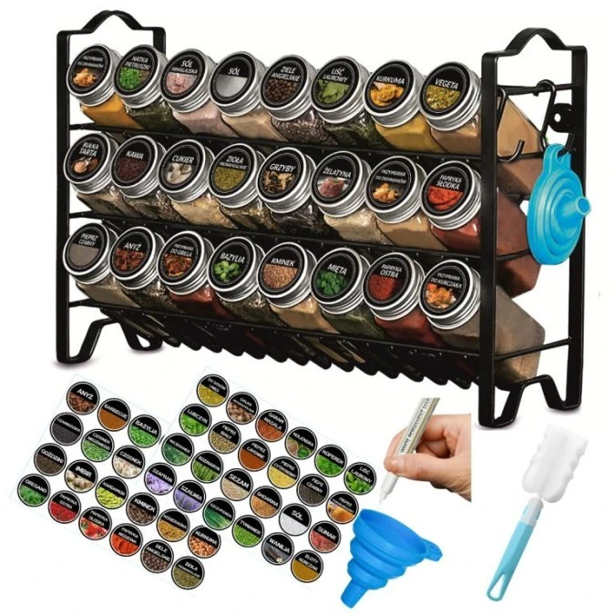 STOJAK NA PRZYPRAWY 24 SZKLANE SŁOICZKI POJEMNIKI ORGANIZER 72 NAKLEJKI