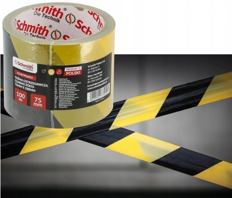 Taśma ostrzegawcza żółto-czarna foliowa budowlana BHP 75mm 100m SCHMITH