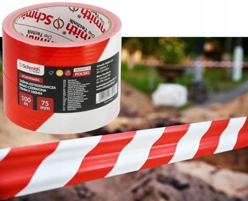 Taśma ostrzegawcza biało-czerwona foliowa budowlana BHP 75mm 100m SCHMITH