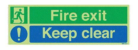 1. Znak wyjścia, Poliester winylowy, Niebieski/zielony/biały, Fire Exit, Keep Clear, Angielski, Opis: Nie zastawiać 46.24