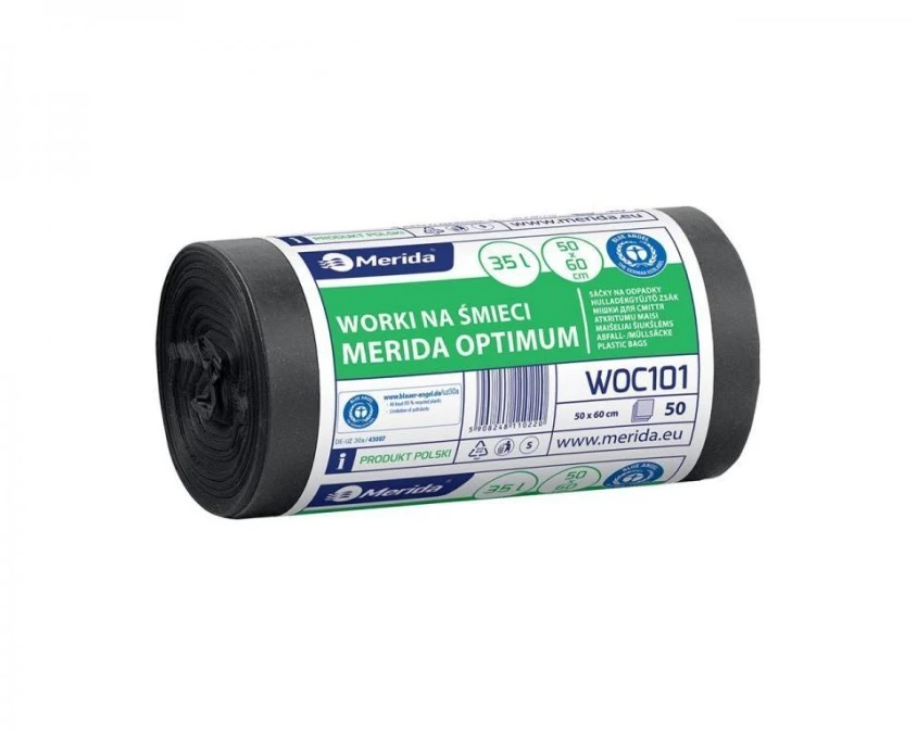 15. Merida Worki na śmieci MERIDA OPTIMUM mocne, 50 x 60 cm, pojemność 35 l, rolka 50 szt., CZARNE, HDPE/LDPE 9.59