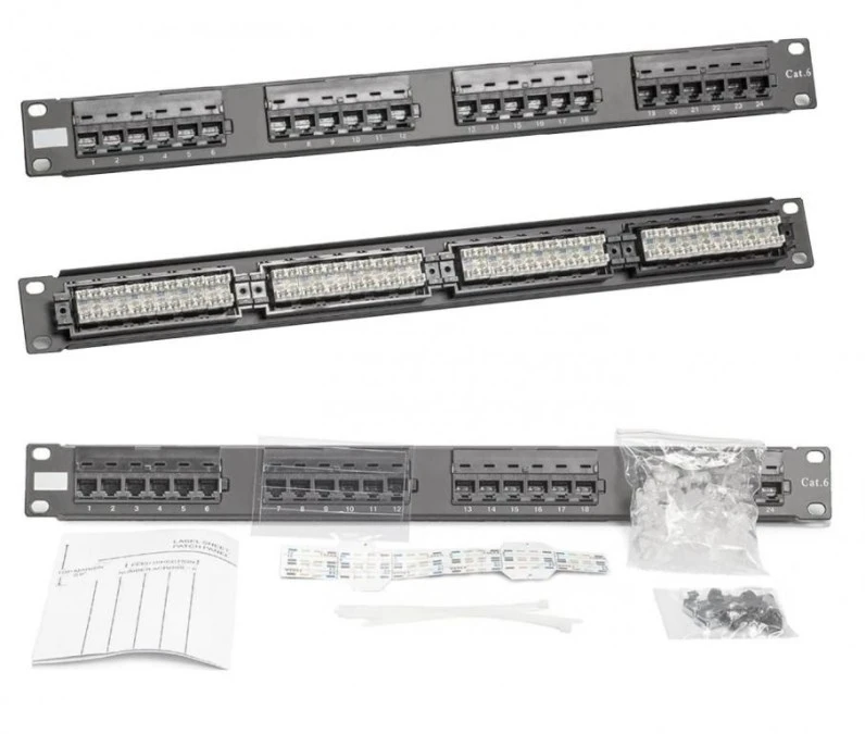 Patch panel RACK 19" kat.6 24p UTP z półką 1U czarny NEKU
