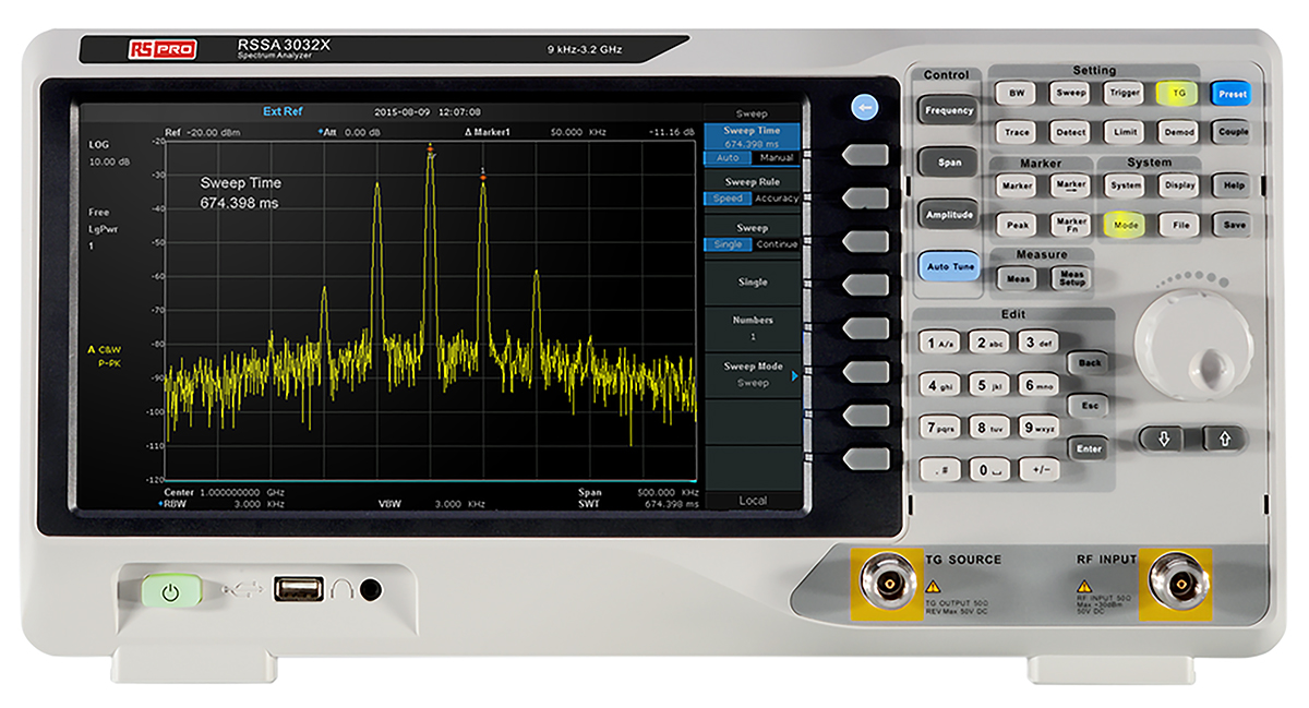 Analizator widma 9 kHz → 3.2GHz RS PRO l. kanałów: 1 3.2GHz Wyświetlacz LCD TFT RJ45, USB-A 2.0, USB-B 2.0