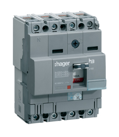 5. Wyłącznik kompaktowy MCCB, 4-biegunowy, 160A, 220/415V, Montaż na szynie DIN, Hager, HHA 7101.00