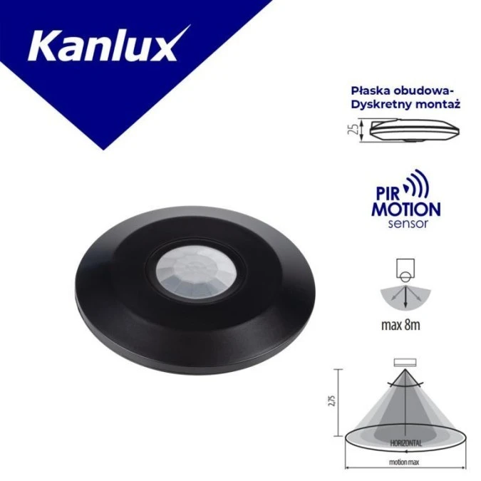 9. Czujnik ruchu PIR ZONA FLAT-B 2000VA Ø11,5 max 8m 360/120 st. IP20 IIkl. nastropowy czarny 37376 24.64