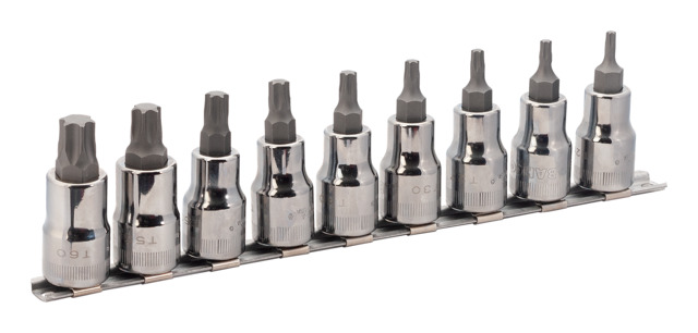 Zestaw końcówek do wkrętaka l. elementów: 9 rozmiar: T20, T25, T27, T30, T40, T45, T50, T55, T60 Zestaw wkrętaków