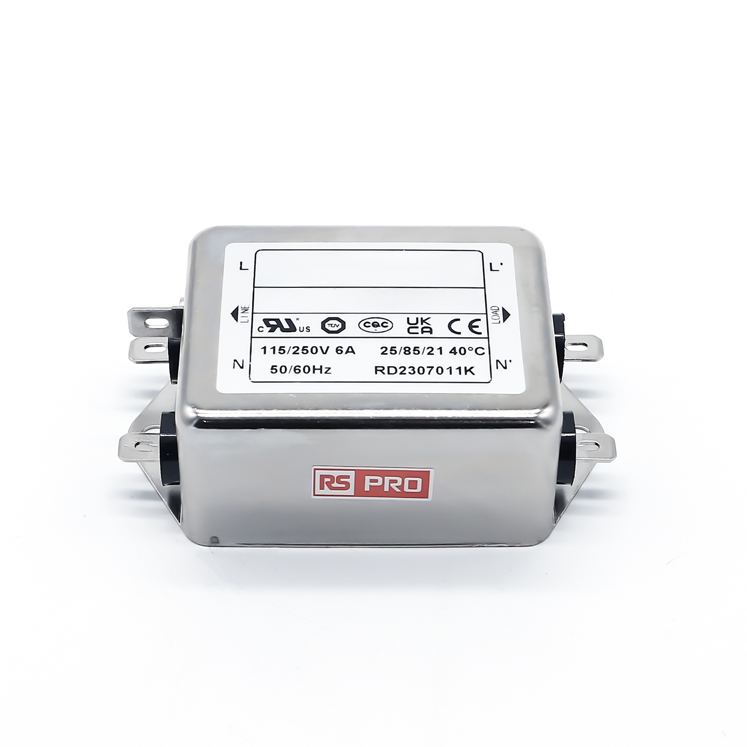 7. Filtr sieciowy 6A 1-fazowy 470kΩ 115/250 V AC 50 → 60Hz 2 x 3,3mH RS PRO Montaż w obudowie 103.48