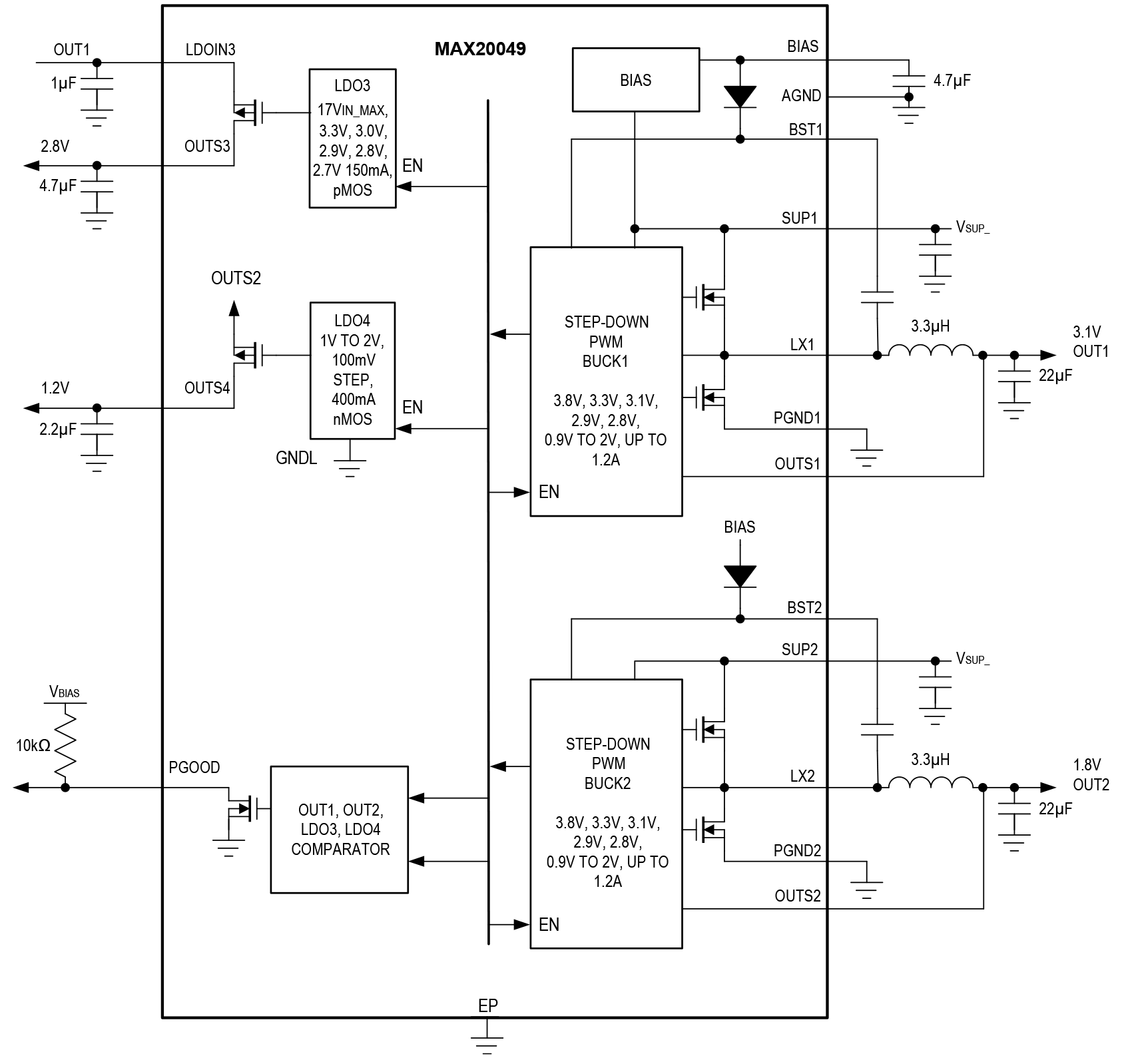 8. Flexible, Compact Quad Power Supply with 2.2MHz, 1A Buck Converters and Dual LDOs for Automotive Camera Modules Sample