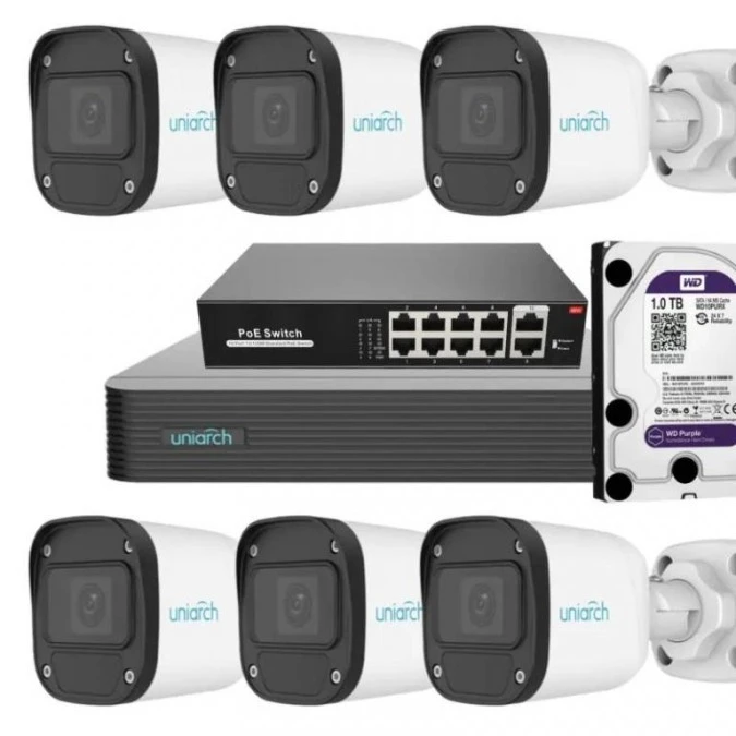 Zestaw monitoringu IP: 6 Kamer tubowych IP 4Mpix 2,8mm, Switch PoE, Rejestrator NVR, Dysk twardy 1TB / UNI-SET-6X4