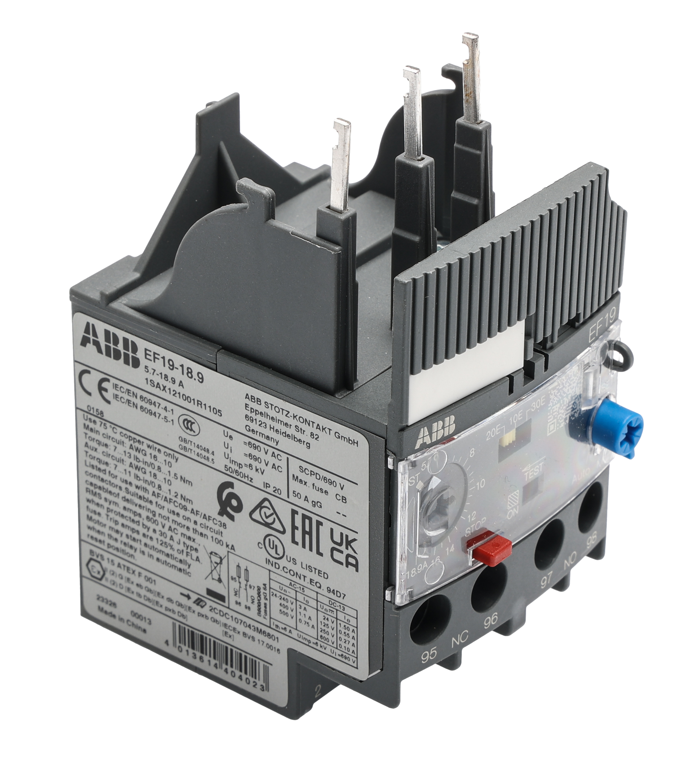 Przekaźnik przeciążeniowy ABB 5,7 → 18,9 A Uz 690 V 18,9 A 0,304 W 1NO + 1NC, reset: ręczny/auto