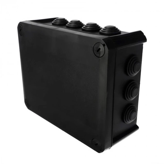 9. Puszka hermetyczna 190x150x75mm natynkowa z dławikami bezhalogenowa, odporna na UV, dekiel przykręcany czarny IP66 18.89