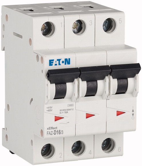 Wyłącznik nadprądowy MCB, Typ D, 3-biegunowy, 16A, 240 → 415V, 60V, na szynę DIN, Eaton FAZ-D16/3