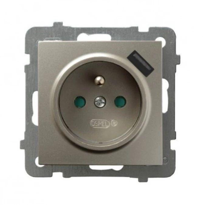 AS Gniazdo pojedyncze z uziemieniem z przesłonami torów prądowych, z ładowarką USB satyna light GP-1GZPUSB/m/45
